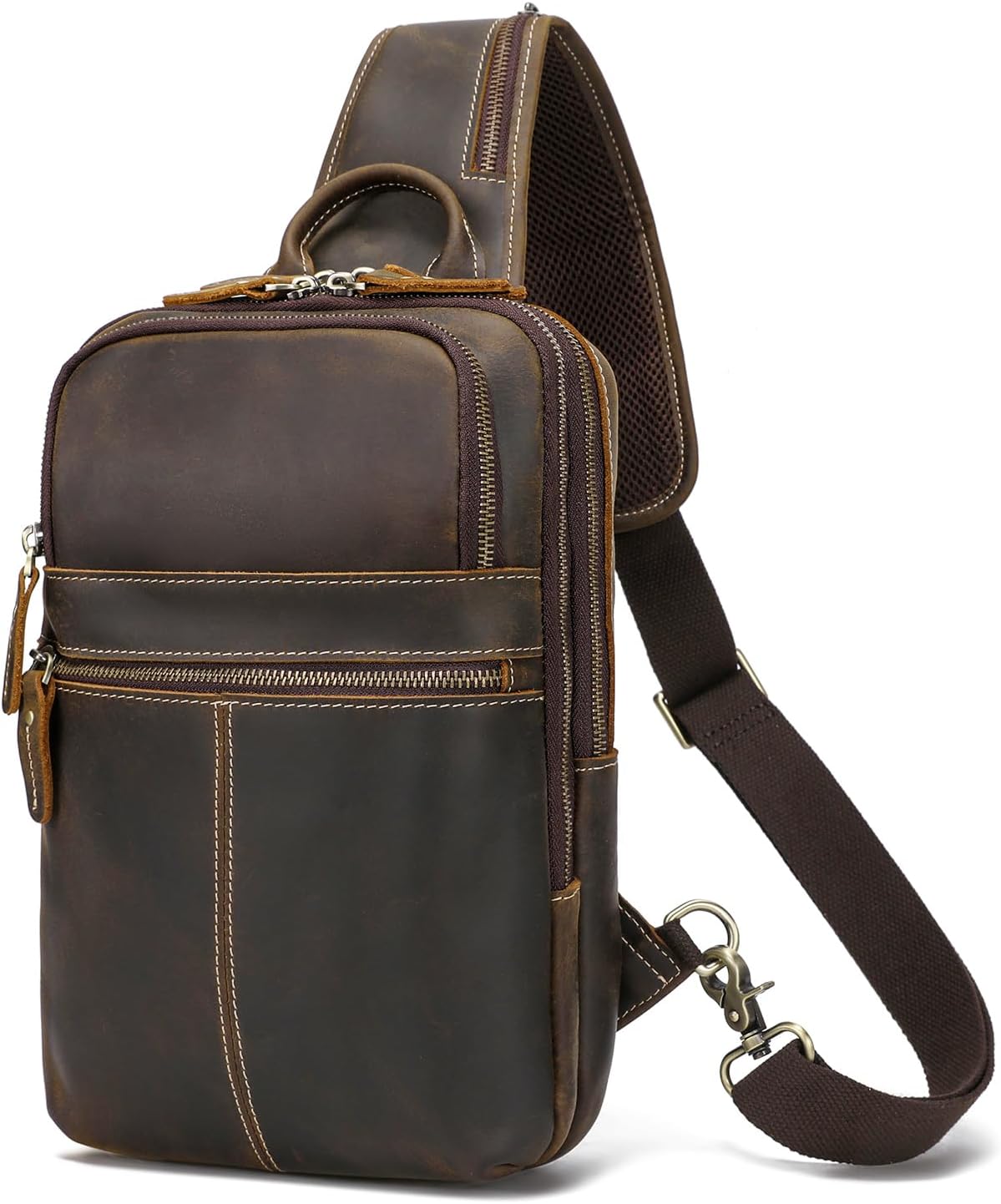 Genuine Leather Sling Bag For Men, Vintage Crossbody Shoulder Chest Daypack Fits 11″ iPad
