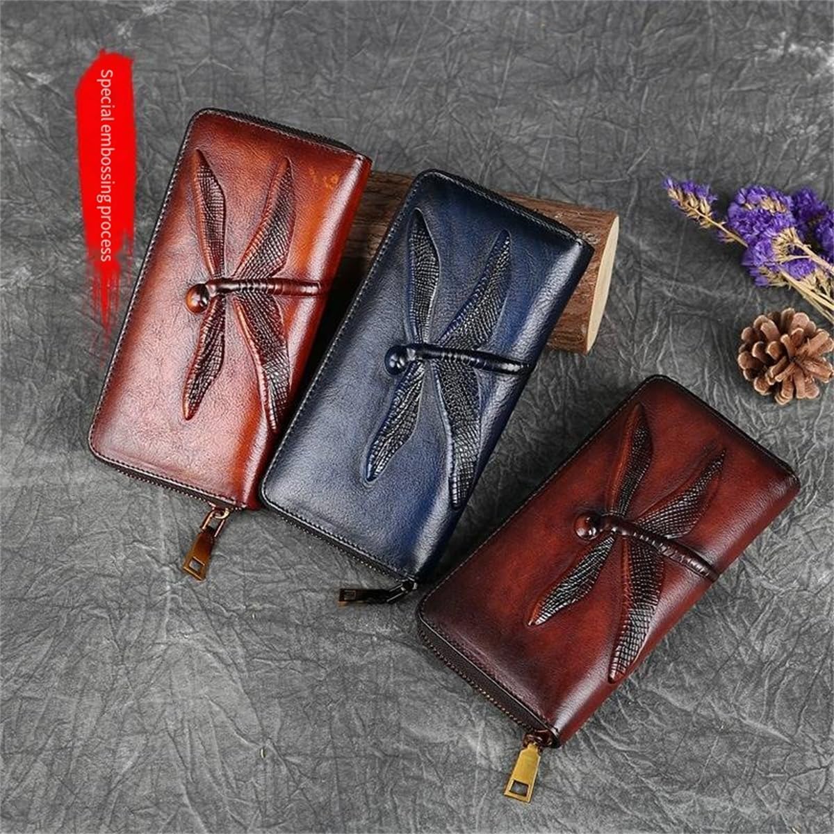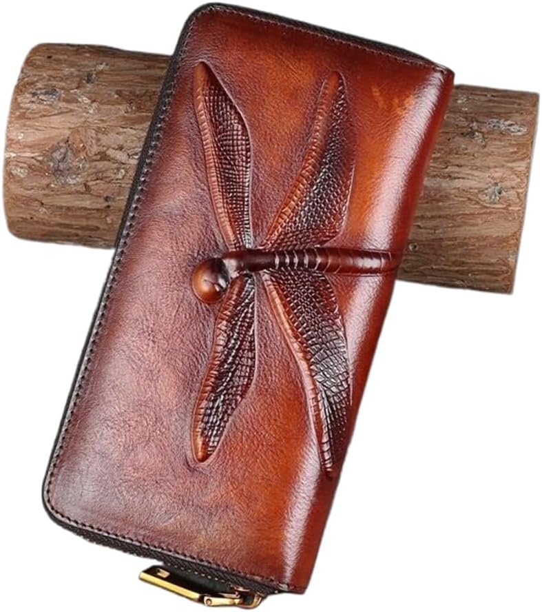 Slim Bifold Leather Wallets for Women Embossed Dragonfly Handmade Leather Wallet Cellphone Clutch Holder Purse (Brown)