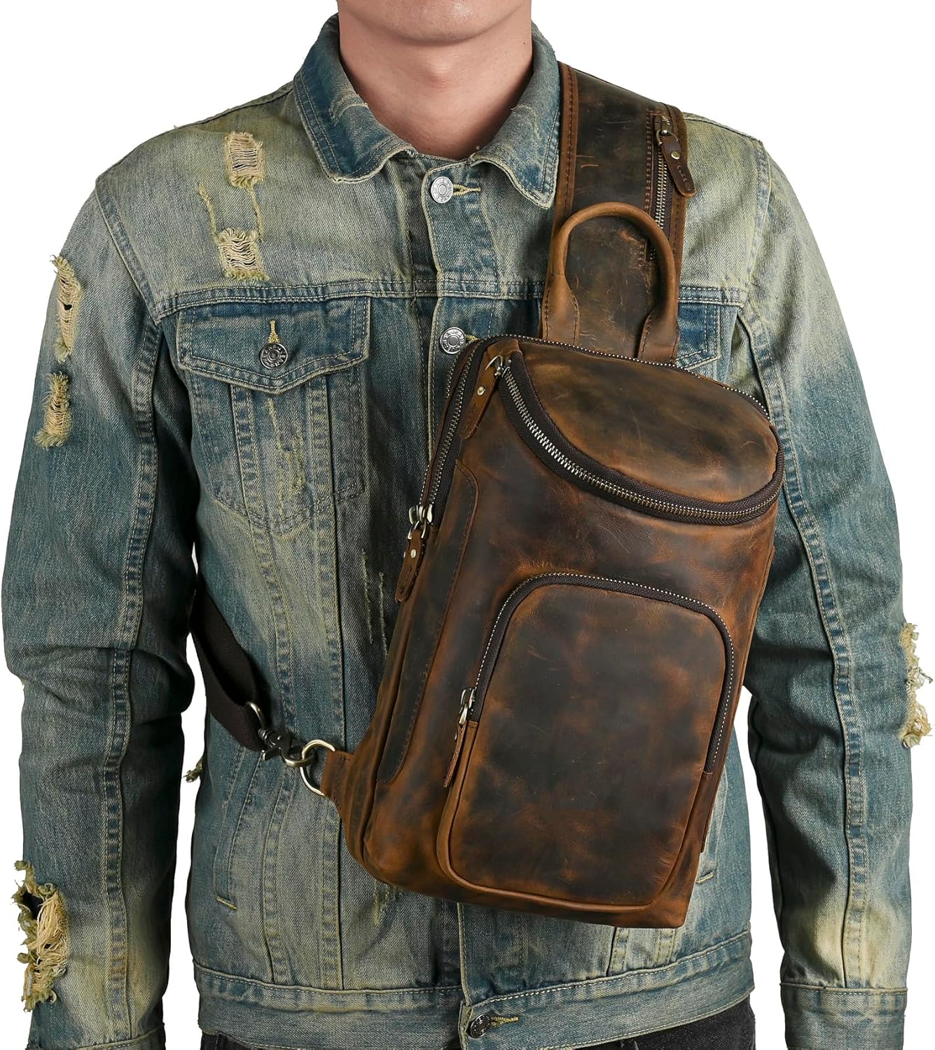 - 【Quality Material】This chest bag is made of quality genuine crazy horse leather trim.The premium quality ensure the long lasting durability. crafted with a tight double-knit weave, it’s strong, hard-wearing, scratch-resistant. The crazy horse leather is made of high-end top layer cowhide material, with a thickness of 2.5mm, which is solid and durable.And the quality solid hardware won’t gather rust easily.